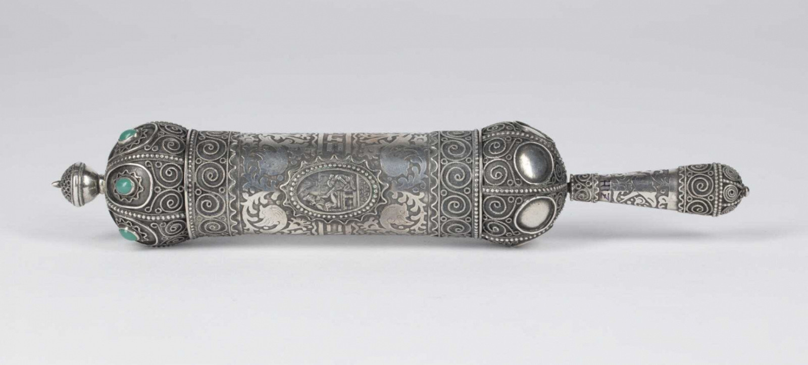 Oprawa do zwoju Estery, między 1906 a 1929, 225x35mm, srebro i chryzoprazy / Zbiory ŻIH, CBJ