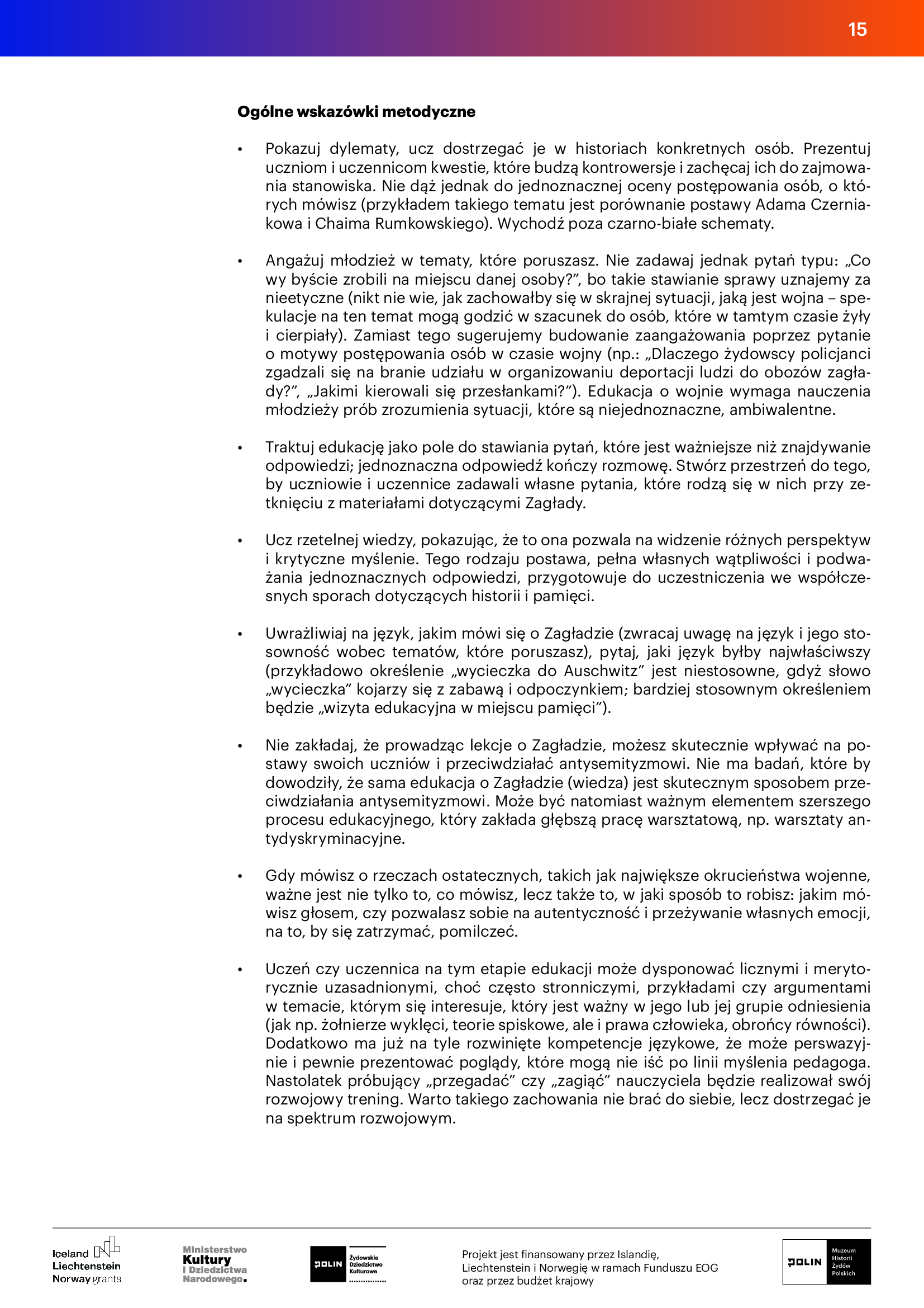 Sugerujemy zatem, niezależnie od tego, z jaką grupą wiekową Państwo pracują, zapoznać się z całością dokumentu. Szczególnie istotne jest dla nas podkreślenie trzech wymiarów edukacji o II wojnie światowej i Zagładzie. Są to: uwrażliwienie i budowanie postaw empatycznych, przekazywanie podstaw wiedzy historycznej z zakresu tej tematyki oraz omawianie szczegółowych informacji wraz z budowaniem odniesienia do współczesności.
