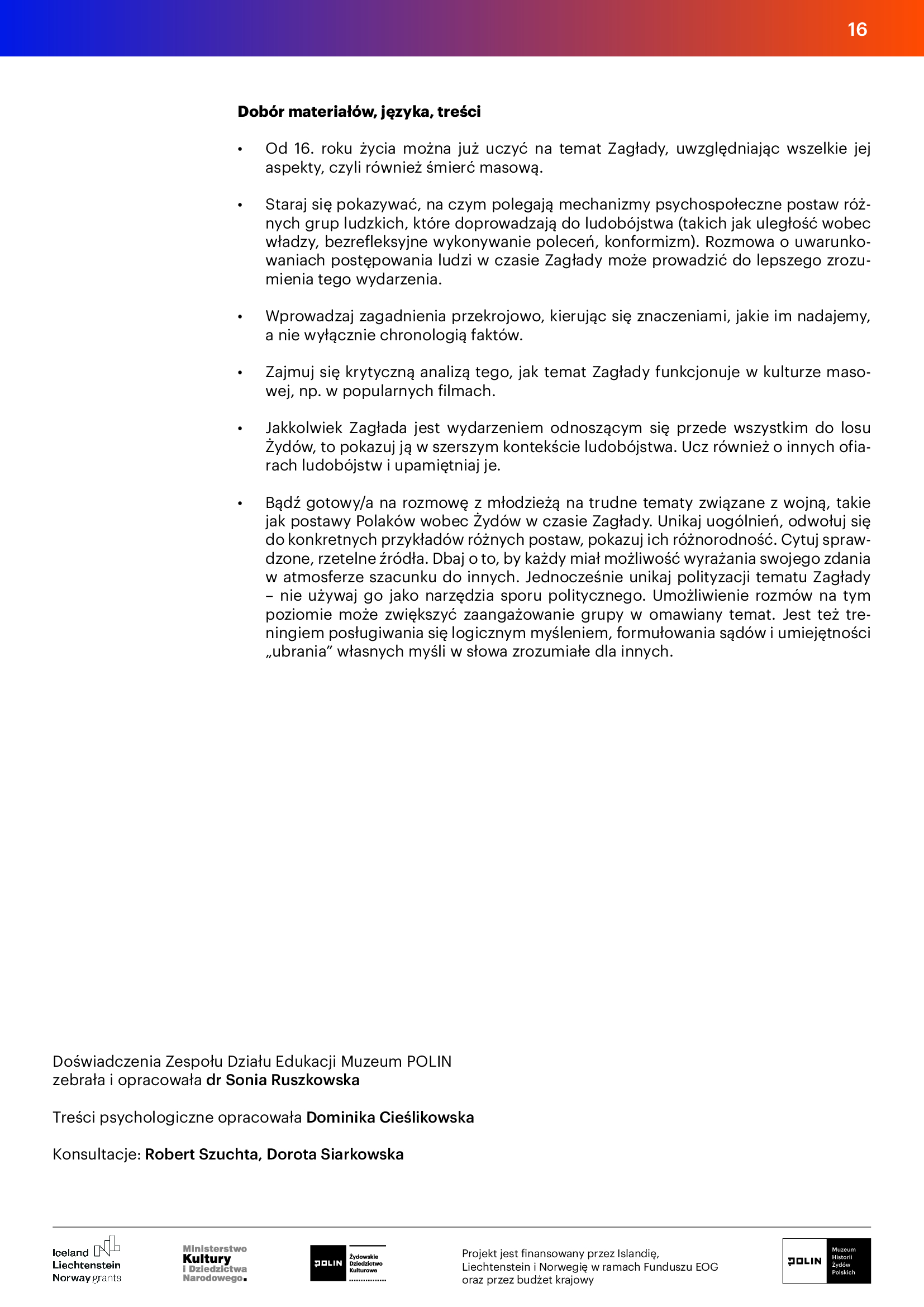 Opisane w dokumencie wskazówki i zalecenia przeznaczone są szczególnie dla nauczycielek i nauczycieli oraz edukatorek i edukatorów pracujących z tematyką II wojny światowej i Zagłady. Mamy jednak nadzieję, że będą one wsparciem także dla rodziców i opiekunów oraz autorek i autorów książek – dorosłych, którzy chcą rozmawiać z dziećmi i młodzieżą o tej tematyce i pragną, by proces ten przebiegał w sposób bezpieczny.