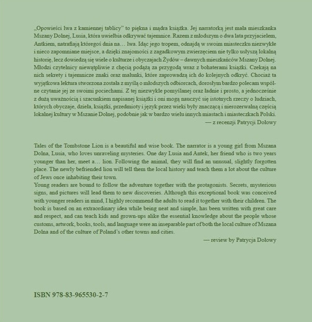 „Opowieści lwa z kamiennej tablicy” to piękna i mądra książka. Jej narratorką jest mała mieszkanka z Mszany Dolnej, Lusia, która uwielbia odkrywać tajemnice. Razem z młodszym o dwa lata przyjacielem, Antkiem natrafiają któregoś dnia na… lwa. Idąc jego tropem, odnajdą w swoim miasteczku niezwykłe i nieco zapomniane miejsce, a dzięki znajomości z zagadkowym zwierzęciem nie tylko usłyszą lokalną historię, lecz dowiedzą się wiele o kulturze i obyczajach Żydów – dawnych mieszkańców Mszany. Młodzi czytelnicy niewątpliwie z chęcią podążą za przygodą wraz z bohaterami książki. Czekają na nich sekrety i tajemnicze znaki oraz malunki, które zaprowadzą ich do kolejnych odkryć. Lecz chociaż ta wyjątkowa lektura stworzona została z myślą o młodszych odbiorcach, dorosłym bardzo polecam wspólne czytanie jej ze swoimi pociechami. Z tej niezwykle pomyślanej oraz ładnie i prosto, a jednocześnie z dużą uważnością i szacunkiem napisanej książki i oni mogą nauczyć się istotnych rzeczy o ludziach, których obyczaje, dzieła, książki, przedmioty i język przez wieki były znaczącą i nierozerwalną częścią lokalnej kultury w Mszanie, podobnie jak w bardzo wielu innych miastach i miasteczkach Polski.