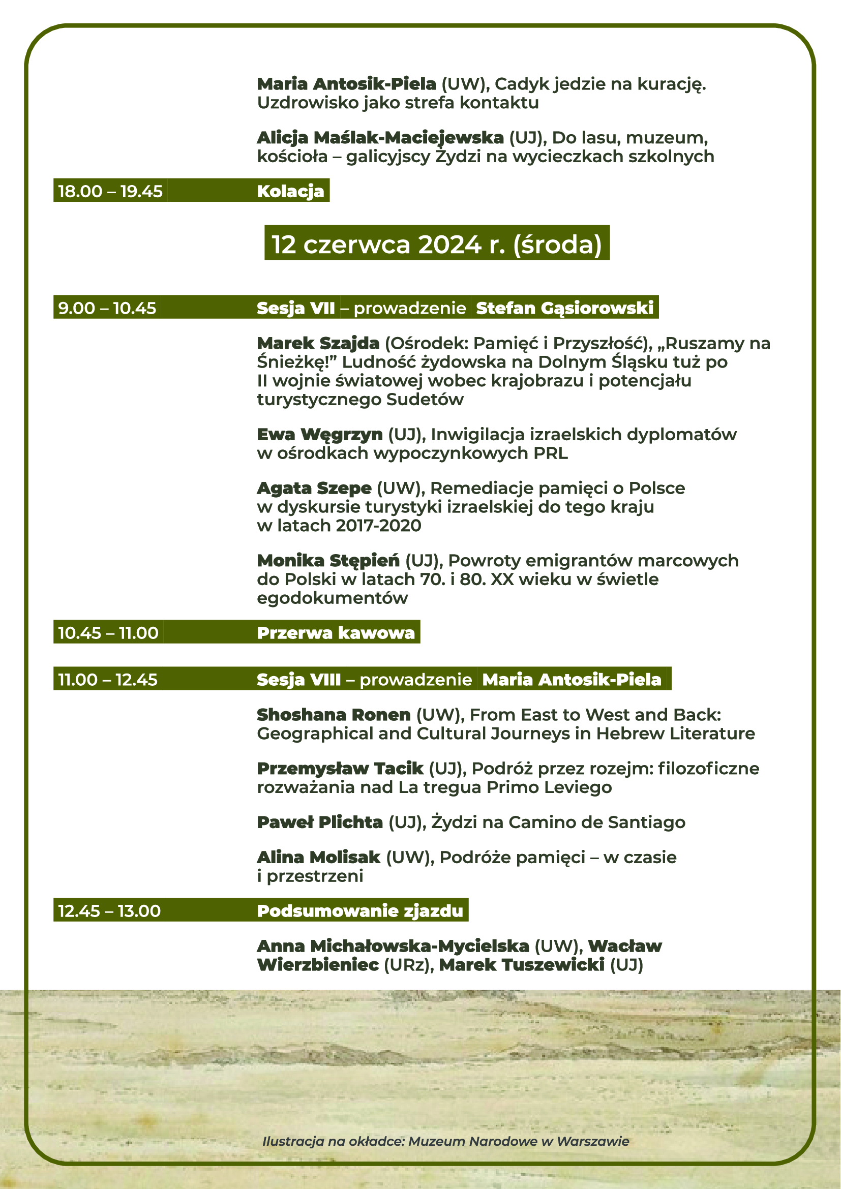 Uczestnicy będą mieli okazję do dyskusji na temat wpływu żydowskiego prawa religijnego na decyzje o podróżach, warunków życia w trakcie podróży, interakcji z otoczeniem oraz zmian towarzyszących różnym modelom podróżowania.