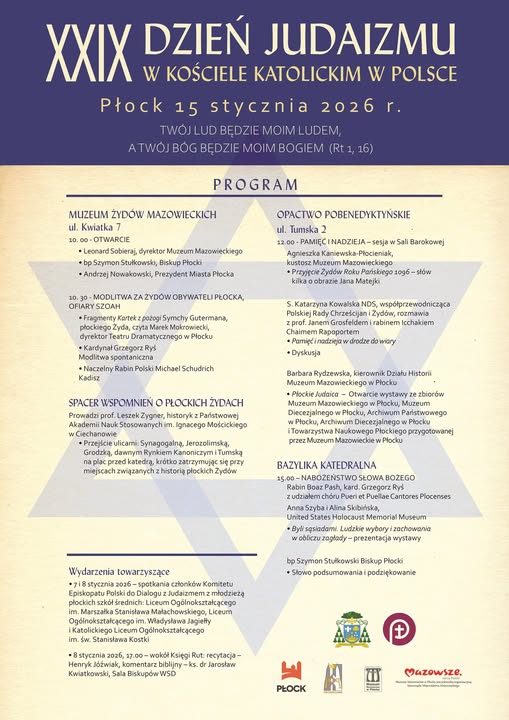 Obchody XXIX Dnia Judaizmu w Kościele katolickim w Polsce organizowane były w tym roku w Płocku. Spotkaniu towarzyszyły słowa zaczerpnięte z Księgi Rut: „Twój lud będzie moim ludem, a twój Bóg moim Bogiem” (Rt 1,16), które wyznaczyły rytm całego dnia, naznaczonego refleksją nad historią, dialogiem i odpowiedzialnością za przyszłość.